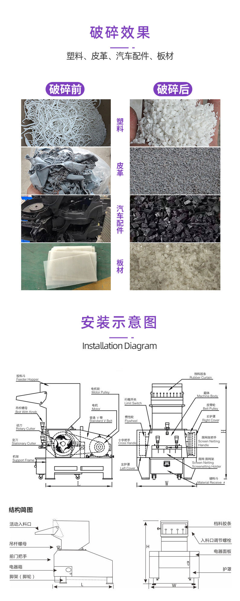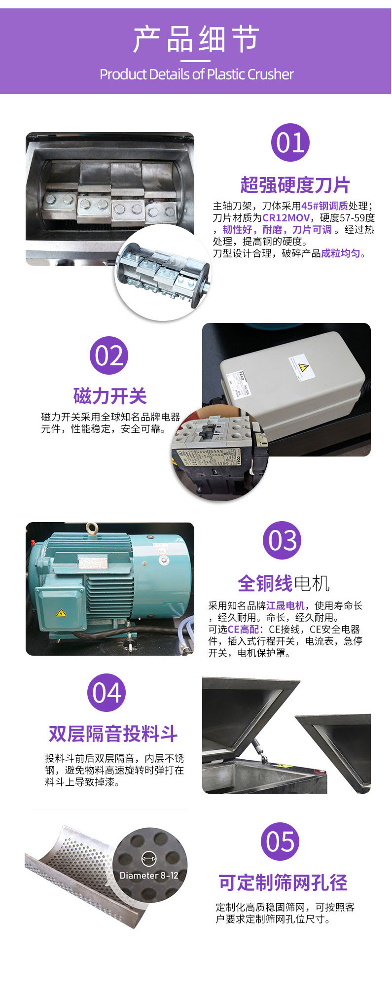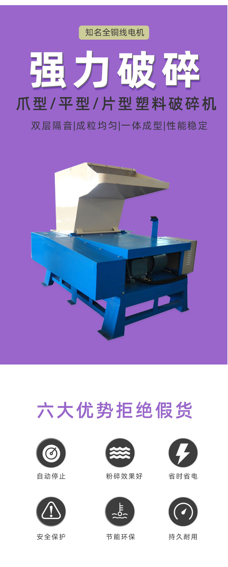 塑料破碎機(jī),大型塑料破碎機(jī)的特點強(qiáng)力破碎機(jī)刀具采用名廠優(yōu)質(zhì)精鋼精工而制,特別堅固耐用,粉碎各類軟、硬塑膠,輕松容易。前后隔音防音設(shè)計,噪音極小。設(shè)計精簡,占地特少,維護(hù)容易。門較式分離設(shè)計,清掃換網(wǎng)特別容易。馬達(dá)裝有過荷保護(hù)與電源連鎖保護(hù),保護(hù)馬達(dá)、刀具、工作人員。制造工藝成熟、機(jī)體、刀架等主要部件采用整體加工,確保配合精度。粉碎膠頭、薄膜,有特別粉碎機(jī)供選擇,以更好的適應(yīng)。